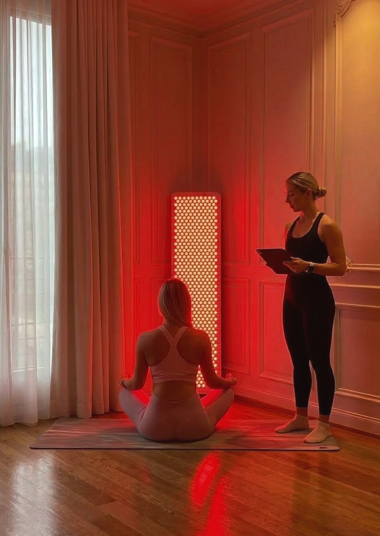 Please wear light, comfortable, athletic clothing (yoga-style). We’ll be working with red light therapy — the more skin is exposed, the more effective the benefits.